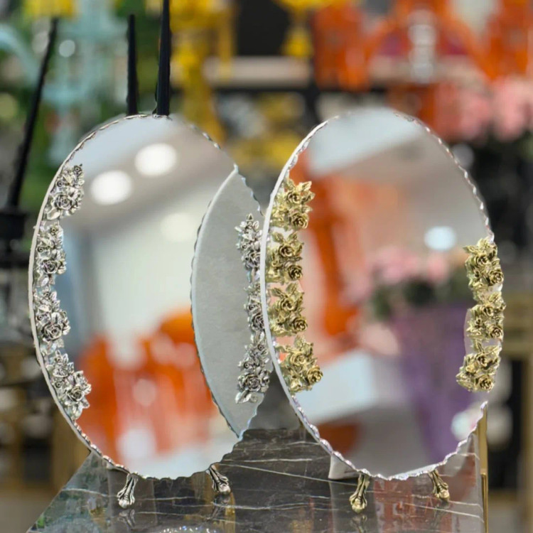 آیینه هفت سین بیضی با طراحی طلایی و سیلور، مناسب برای تزئینات نوروز.