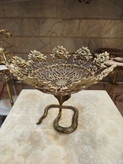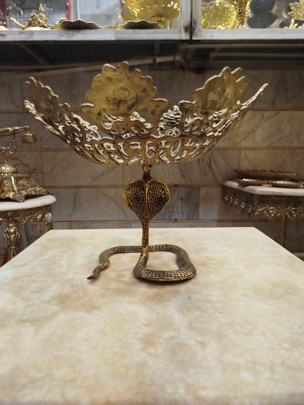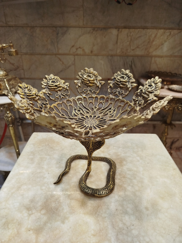 ظرف برنزی خرما خوری در طرح مار کبری ایستاده، رنگ طلایی با بشقاب بزرگ ظرف برنزی خرما خوری در طرح مار کبری ایستاده، رنگ طلایی با بشقاب بزرگ