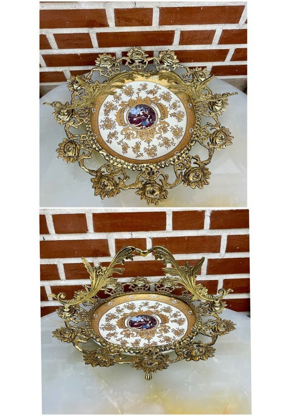 شیرینی خوری برنز و چینی طرح دار(کرم طلایی)